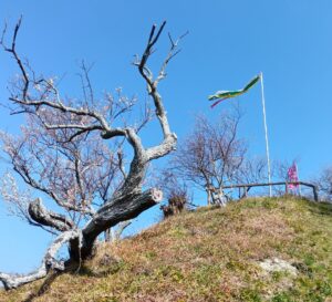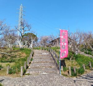 全体的に開花状況は一分咲きから三分咲きといったところ。 大六天神の参道には、のぼり旗に加え吹き流しが設置されています。 あずまやの近くの白梅も見ごろになってきました。