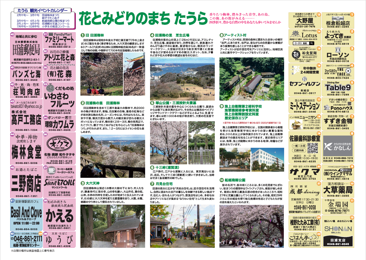 田浦周辺の散策に便利です。 たうら観光マップは駅や行政センターなどに置いてあります。